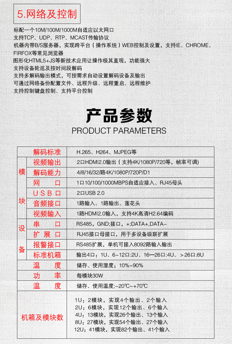 網(wǎng)絡(luò)數(shù)字解碼矩陣切換器采用最新的安防專用編解碼芯片,專為H.265標(biāo)準(zhǔn)及4K超高清編解碼而設(shè)計(jì),產(chǎn)品采用嵌入式LINUX架構(gòu),保障系統(tǒng)的穩(wěn)定運(yùn)行,采用模塊化設(shè)計(jì),可以在大型、超大型數(shù)字安防監(jiān)控系統(tǒng)中實(shí)現(xiàn)解碼、編碼、拼接、分割、畫(huà)中畫(huà)、漫游等功能,為工程項(xiàng)目最大程序解決大數(shù)據(jù)數(shù)字化監(jiān)控系統(tǒng)提供解碼上墻及多信號(hào)輸入編碼等提供一站式解決方案;設(shè)備采用全鋁標(biāo)準(zhǔn)機(jī)箱,結(jié)構(gòu)上大氣美觀可靠,散熱性結(jié)構(gòu)化好。