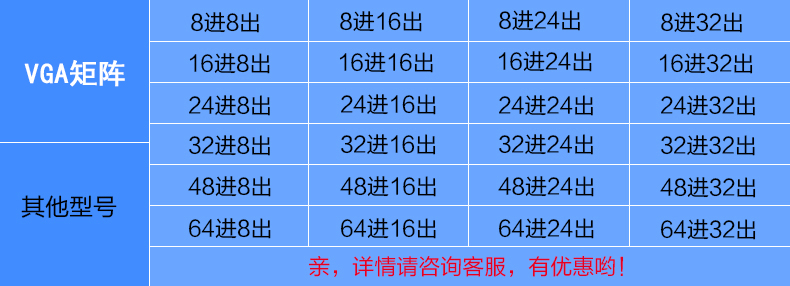 提供VGA04*04(4進4出)至VGA128*128(128進128出)各個型號。