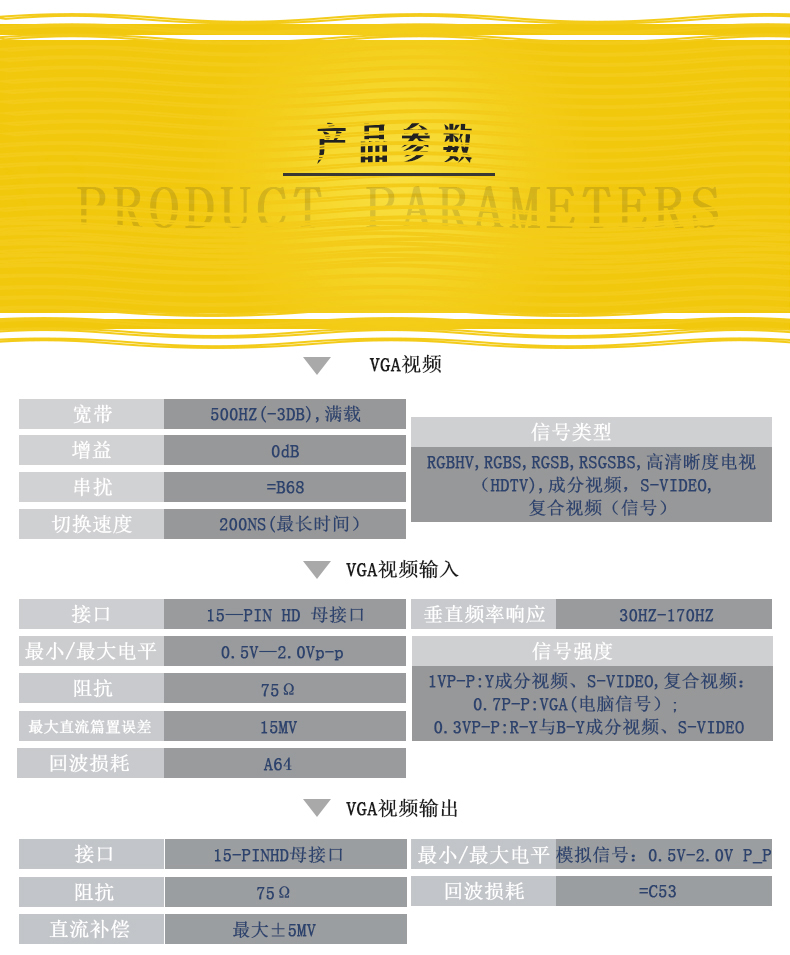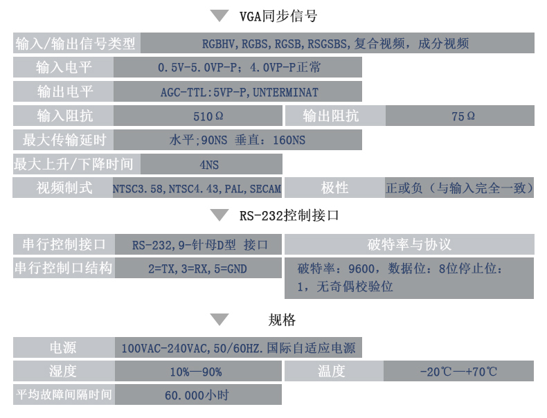 - 支持信號類型有:VGA、RGBHV、RGBS、RGsB、合視頻、S-視頻、分量視頻。